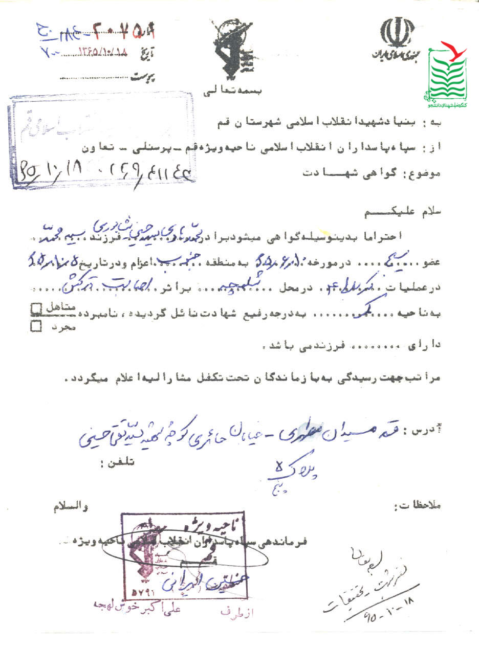 نظرات : با سلام - اين شهيد عزيز كه منسوب به شهداي بهداري استان قم مي باشد و ما طي تحقيقي كه كرده ايم برخي از اطلاعات را كه مرتبط با اين شهيد عزيز است در صفحه اختصاصي ايشان گرد آوري كرده ايم - خوشحال مي شويم شما هم ديدن فرماييد و هم از اطلاعات آن براي تكميل نمودن ساييتون در مورد اين شهيد بهره ببريد و ما رو نيز دعا كنيد. چانچه از شهداي منسوب به بهداري قم و اين شهيد عزيز اطلاعات جديدي به دست آوريد براي ما هم بفرستيد راه ارتباطي با ما در صفحه شهيد آمده است و تلفن خودم را هم مي گذارم - اجرتون با شهدا . آدرس صفحه شهيد : http://shohadayebehdari.blogfa.com/page/139